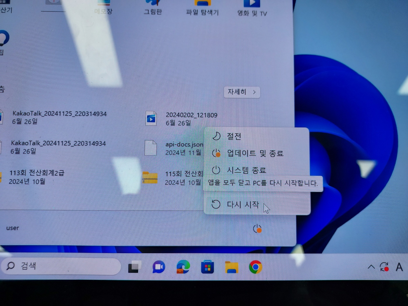 노트북에 있는 다시시작을 누르기 전에 Shift 키를 꾹 누른채, 다시 시작을 누른다.