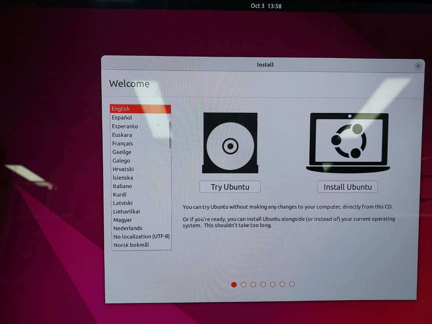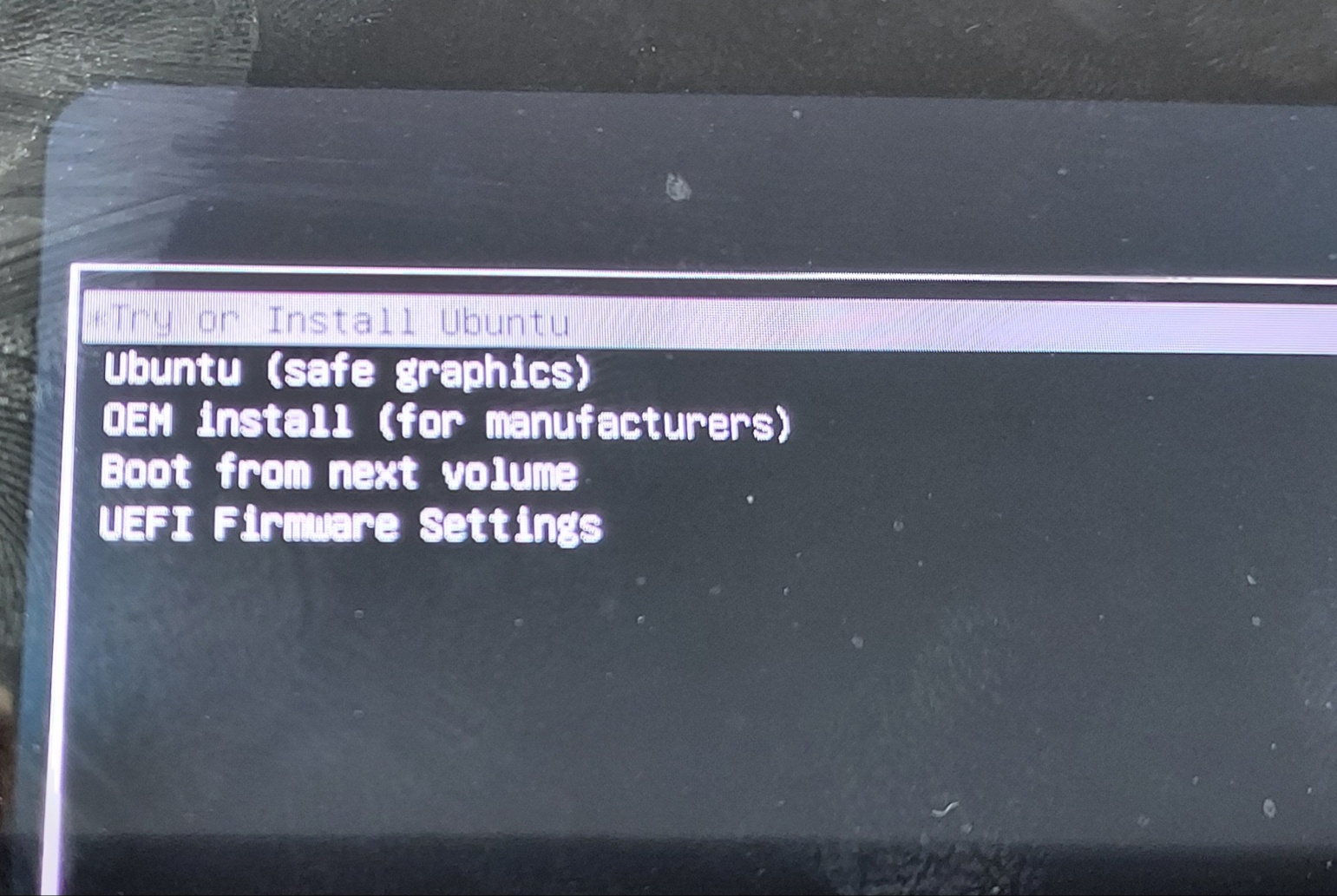 이 모든 과정을 다 하였다면 부팅할때 우분투 설치 화면이 먼저 나오게 된다.