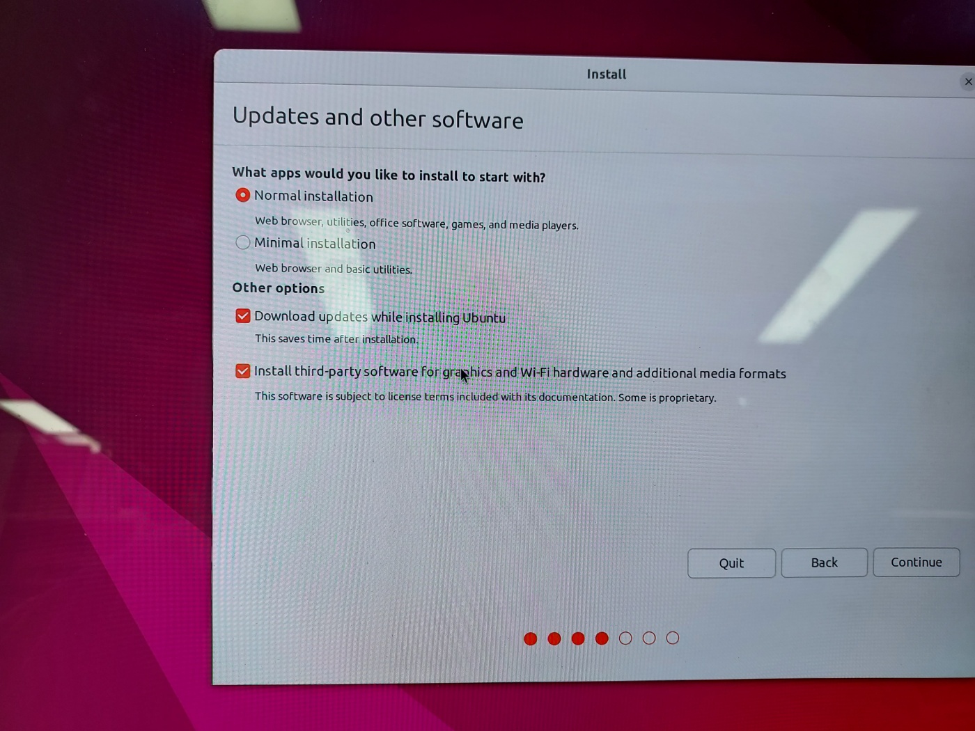 여기서 Noraml installation을 체크해준다. 그리고 아래에 있는 그래픽과 WiFi 하드웨어, 추가 미디어를 위한 서드파티 소프트웨어 설치는 무조건 하는게 좋다. 이거 안 하면 나중에 삼성 노트북 무선 랜카드나 이런저런 드라이버 못 잡아서 다시 세팅하느라 고생할 수 도 있다.