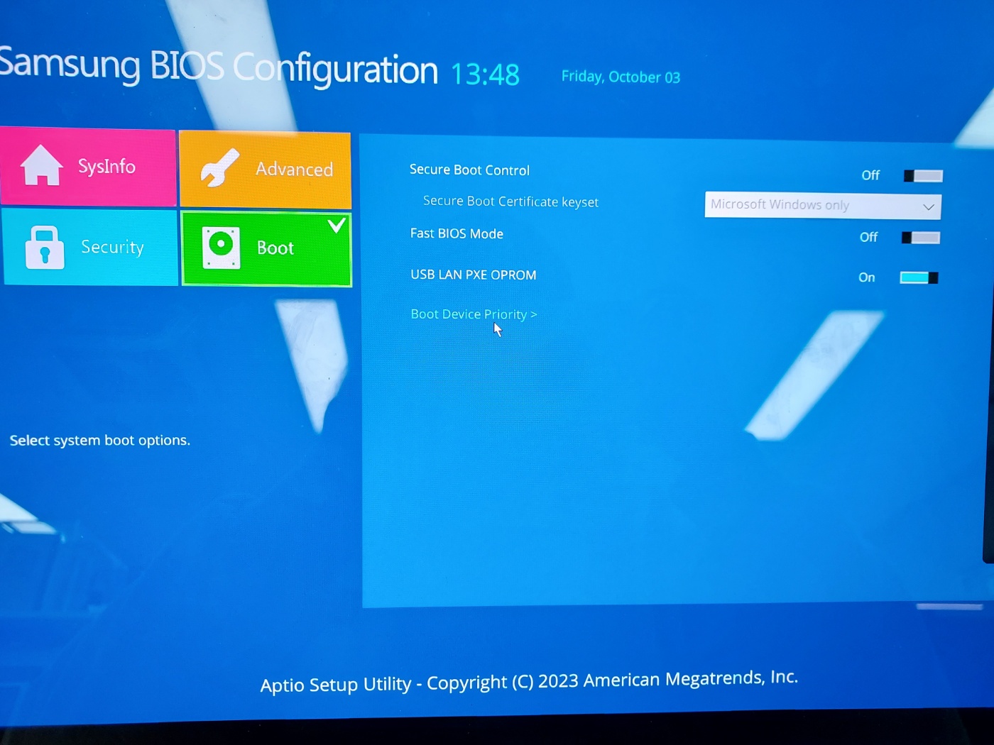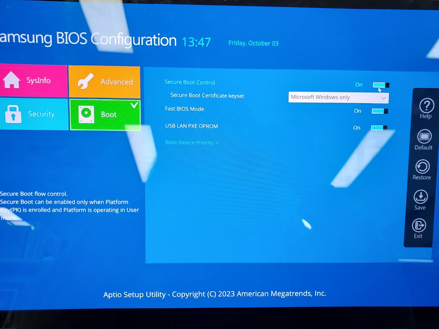 Boot를 눌러서 Secure Boot Control과 Fast BIOS Mode를 off로 바꾸어준다.