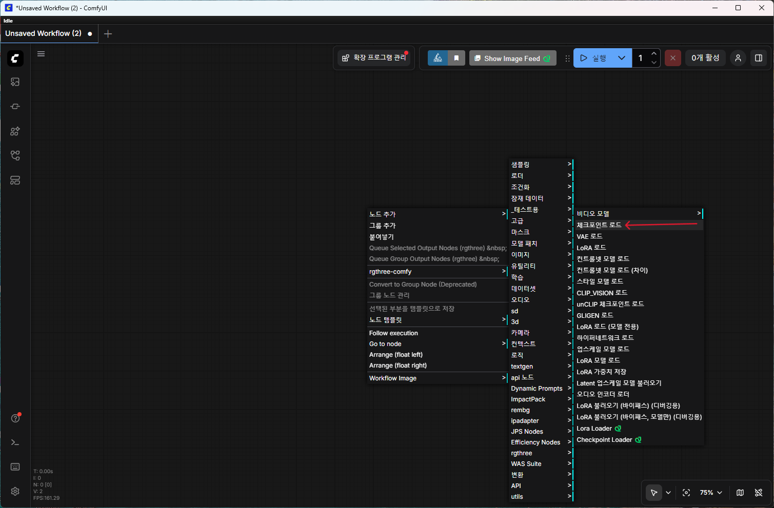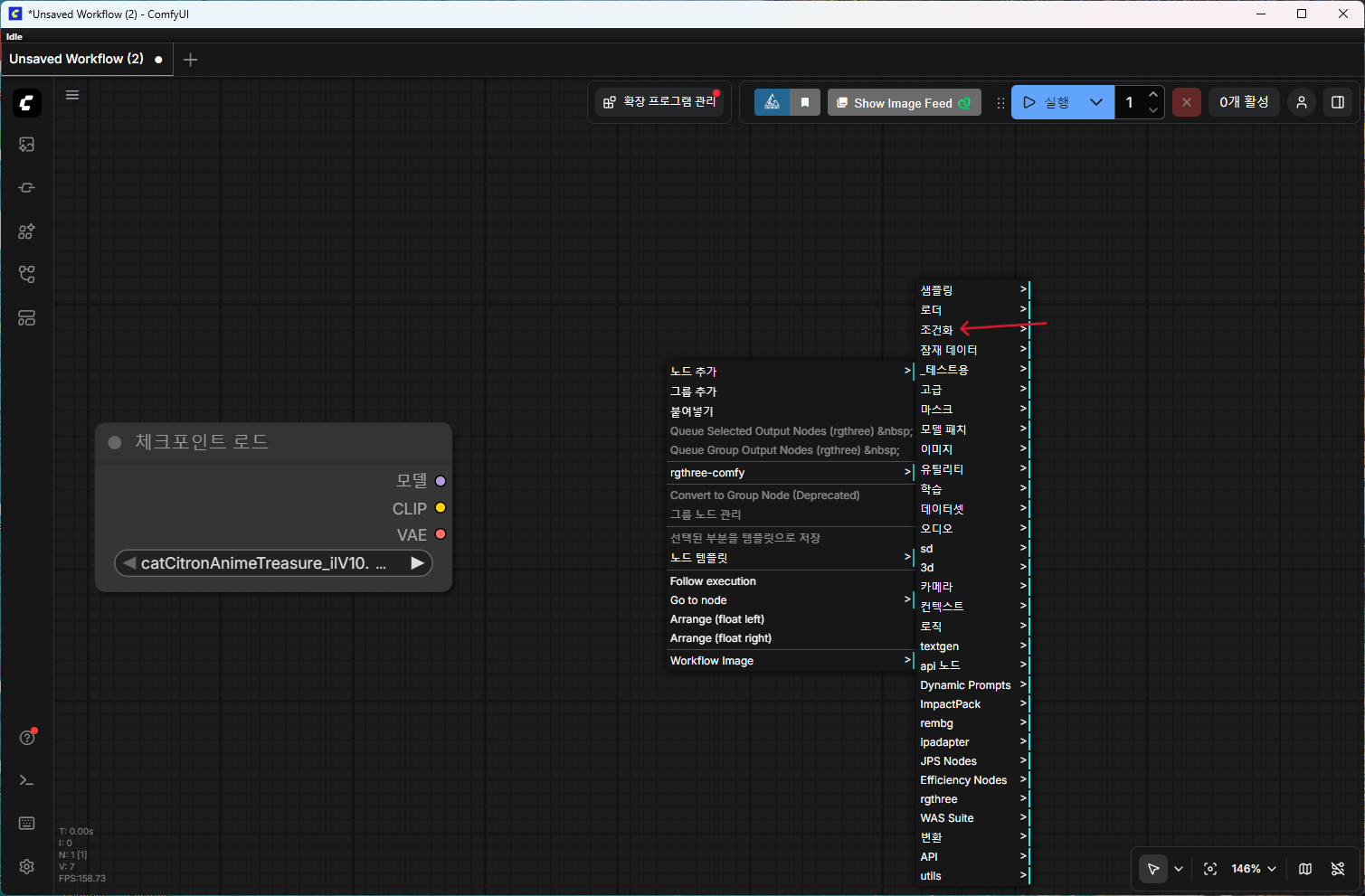 먼저 체크포인트 모델을 불러와야 한다. 마우스 우클릭으로 해당 창을 띄우고 노드 추가를 클릭