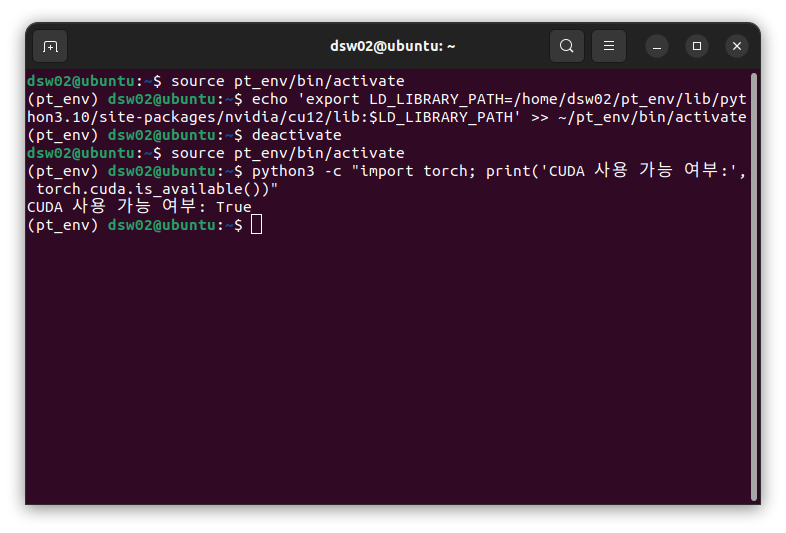 1. 필수 시스템 패키지 및 가상 환경 툴 설치sudo apt-get updatesudo apt-get install -y python3-pip libopenblas-dev virtualenv 2. 가상 환경 생성 및 진입python3 -m virtualenv -p python3 pt_envsource pt_env/bin/activate 입력창 맨 앞에 (pt_env)가 떠 있으면 성공 3. 호환되는 NumPy 버전 세팅 (충돌 방지) pip3 install "numpy 4. PyTorch 본체 설치pip3 install torch torchvision torchaudio --index-url https://pypi.jetson-ai-lab.io/jp6/cu126 --trusted-host pypi...